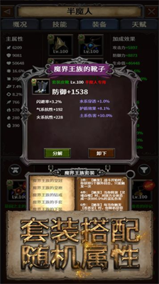 1、装备系统包含普通/魔法/稀有/传说/套装五阶品质,每件装备随机生成属性词条与特殊效果