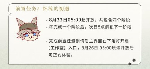 玩家需通关主线第八章第18节关卡,并完整体验四幕前置剧情「怀榛的初遇」,方可解锁私人工作室功能入口。剧情任务采取分阶段解锁机制,8月22日起每日完成当前阶段后,需等待次日凌晨5点刷新后续任务,建议提前规划游戏时间。